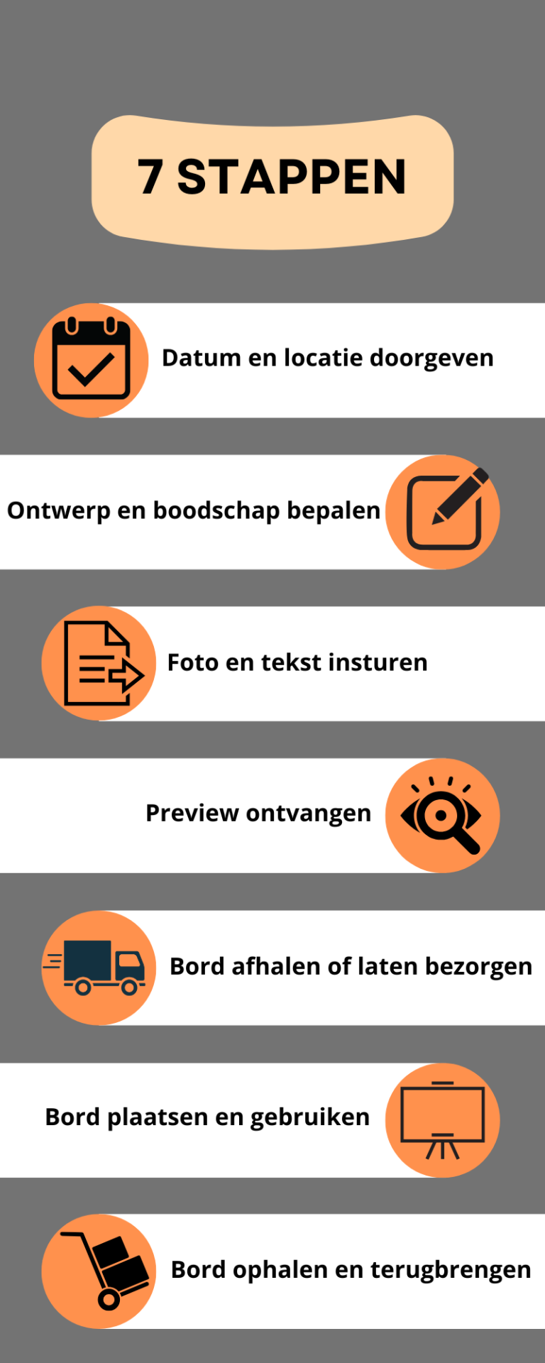 7. Na afloop halen wij het bord weer op. Heb je het zelf opgehaald? Breng het bord dan weer terug naar onze vestiging.